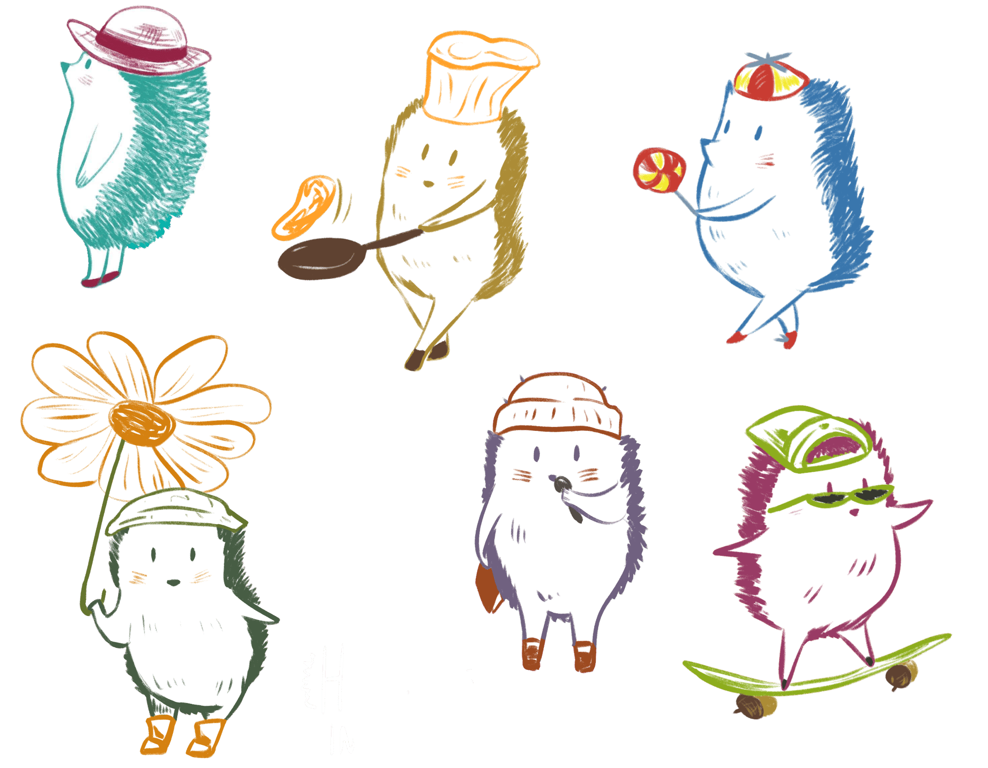 Six hedgehogs in six different hats! Matte 5.1" by 6.4" sheet with six stickers.