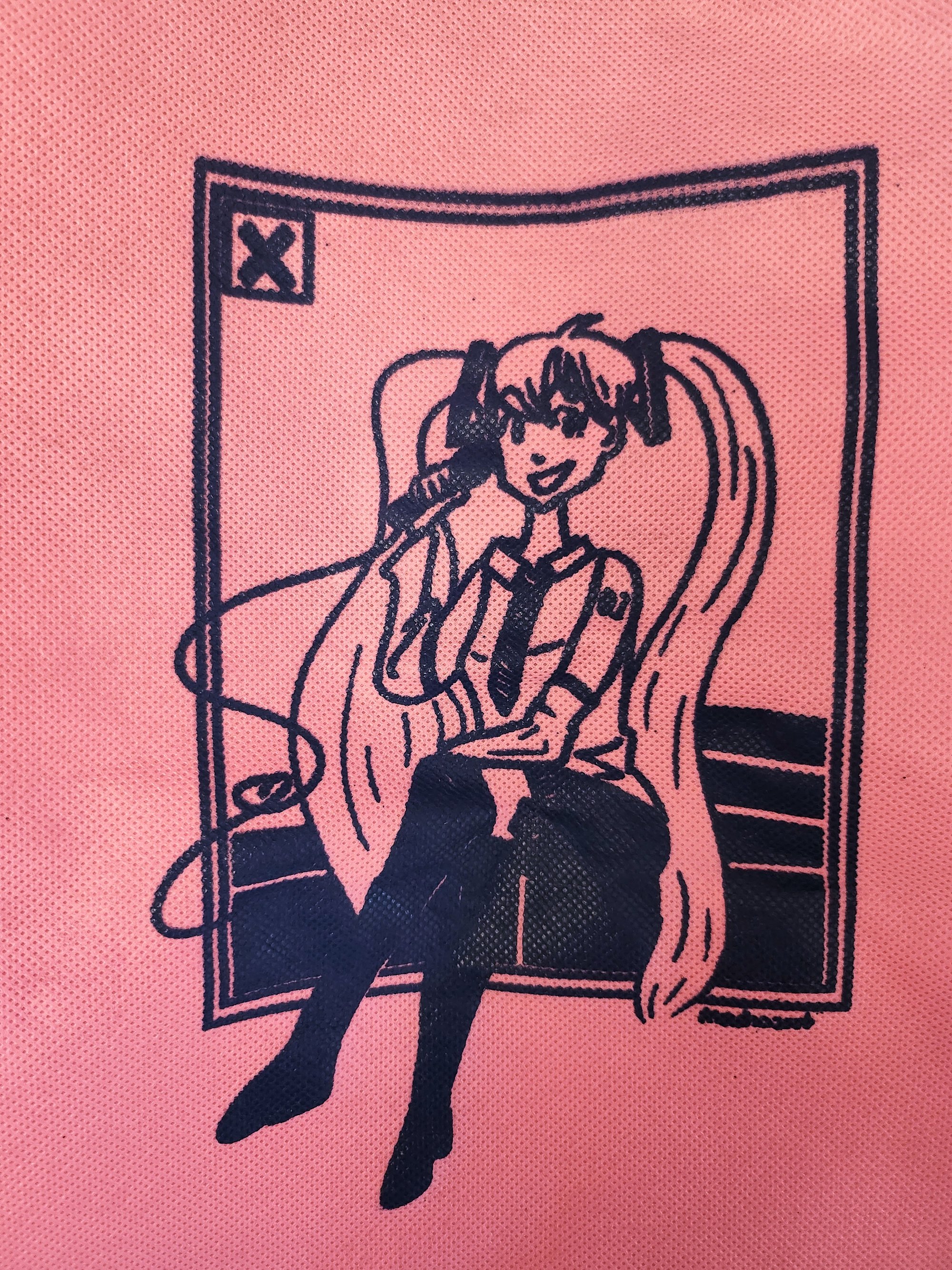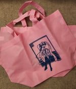 Navy blue screenprint on thin pink cotton canvas. Can hold a lot of stuff!